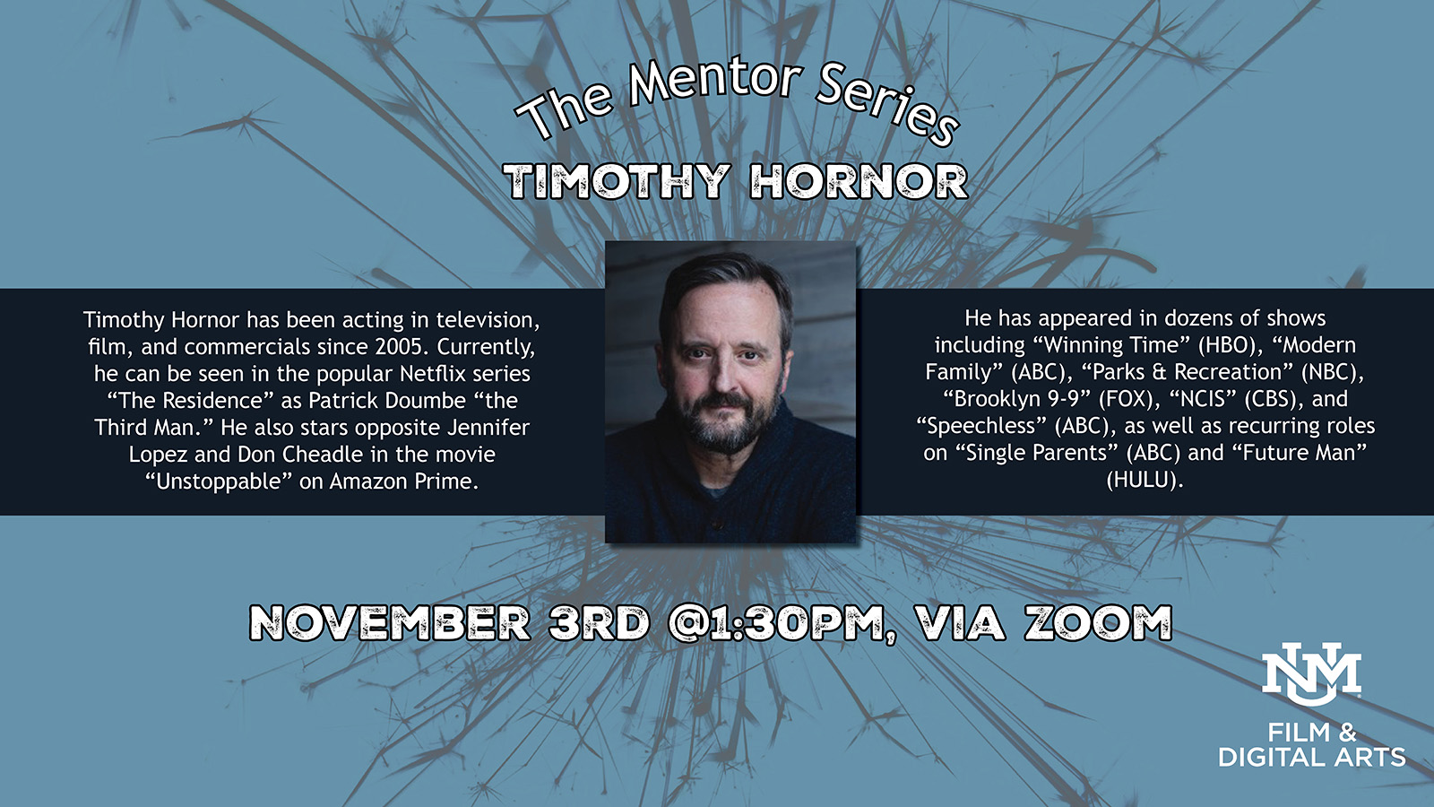 Actor Timothy Hornor (The Residence, Unstoppable, Modern Family, Parks & Recreation) to give talk sharing firsthand insights as a working actor with credits across major networks and streaming platforms Monday, November 3 at 1:30PM via Zoom as part of our...